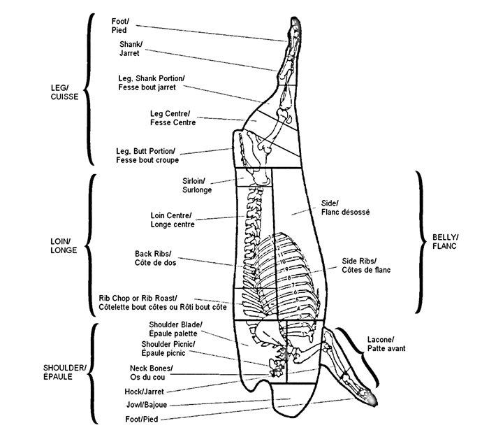 Le samgyeopsal fait partie du flanc de porc. Cette coupe débute sous le rein, où la 5e ou 6e côte et finit au membre postérieur.