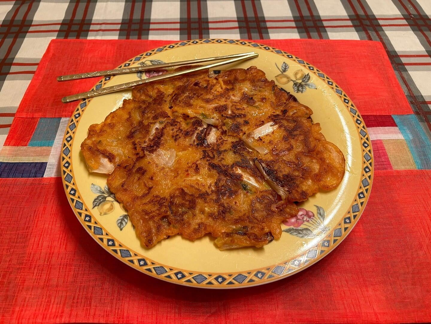 (1/2 oignon, 1 et 1/2 tasse de kimchi, 3/4 tasse de farine, 1/2 tasse d'eau)