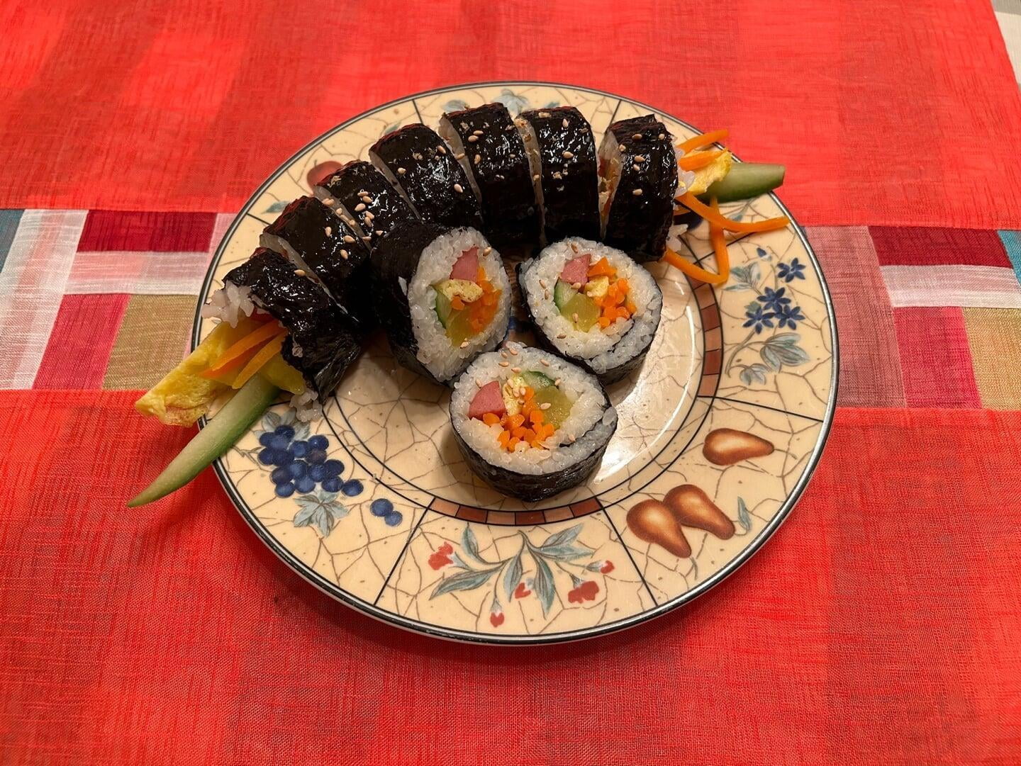 Différent des sushis japonais, le riz des gimbap est assaisonné autrement et n’utilise pas de poisson cru. Le met contient plutôt une viande, des saucisses ou de la chaire de crabe (plus facilement accessible au Québec en goberge). Ce met sest généralement consommé lors d'événements extérieurs.
