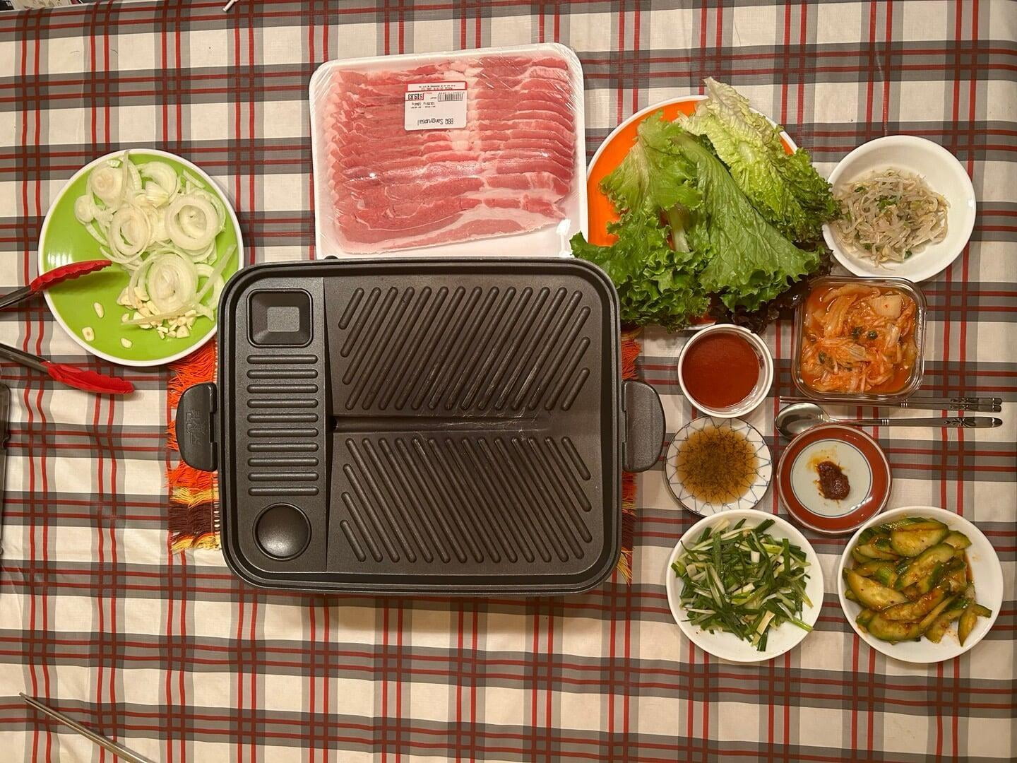 Le samgyeopsal se mange généralement avec des plats d'accompagnement et le ssam (feuilles de salade) qui sert d'emballage pour la viande, le riz, la sauce et les accompagnements. Pour la viande, il suffit de la cuire sur une poêle ou de la griller sans l'assaisonner. Donc cette recette sera inclinée sur les plats d'accompagnement qui vont bien avec le samgyeopsal. Ce repas est généralement consommé avec de l'ail grillé/cuit et du kimchi grillé/cuit.